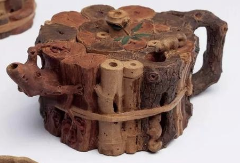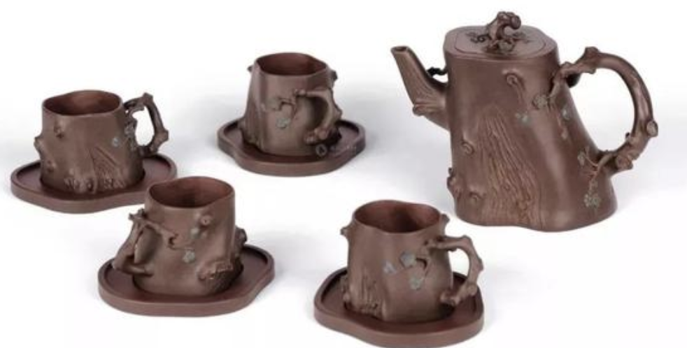 這一套茶具創(chuàng)造的閉頭是供春壺的身筒和杯子的身筒,由于供春壺壺身是“樹癭”,也即是大樹虬枝上的樹瘤,有凹有凸。樹癭紋路要亂而沒有散,完全效驗(yàn)又央求骨血?jiǎng)蚝?、精力豐滿,藝術(shù)作風(fēng)協(xié)調(diào)一致。