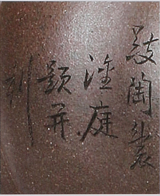 任淦庭出身書香世家,他只讀過三年私塾,因幼年喪父,故時常以樹枝作筆,席地而畫:中年喪母,命運多舛。他酷愛書畫,潛心研究紫砂雕刻技藝,并師承清代末年宜興書畫家、金石家陳懋生、陳研卿等人,特別注重寫意筆墨的線條變化。